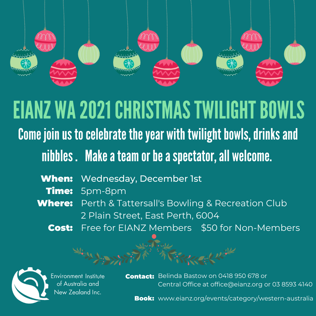 The WA Division of EIANZ invites you to come and join us to celebrate the year with twilight bowls, drinks and nibbles. Make a team or be a spectator. All welcome.