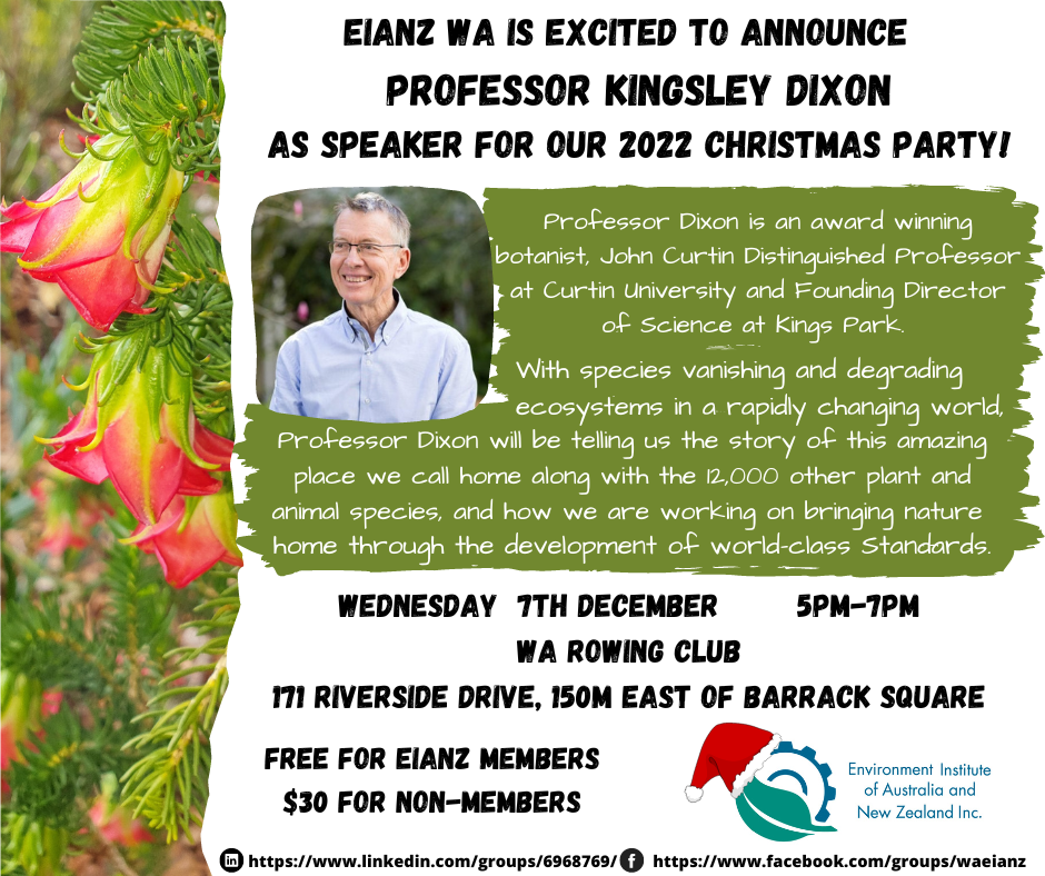 EIANZ WA is excited to announce Professor Kingsley Dixon as speaker for our 2022 Christmas Party. Professor Dixon is an award winning botanist, John Curtain Distinguished Professor at Curtin University and Founding Director of Science at Kings Park.