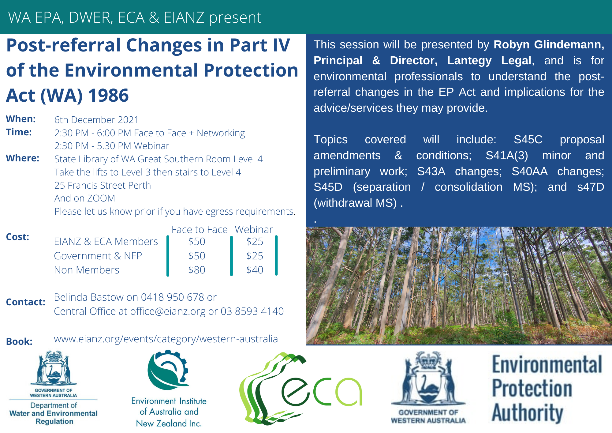 The WA Division of EIANZ in partnership with the WA EPA, DWER and the ECA invite you to Session 1B- Post-referral Changes in Part IV of the Environmental Protection Act (WA) 1986.
