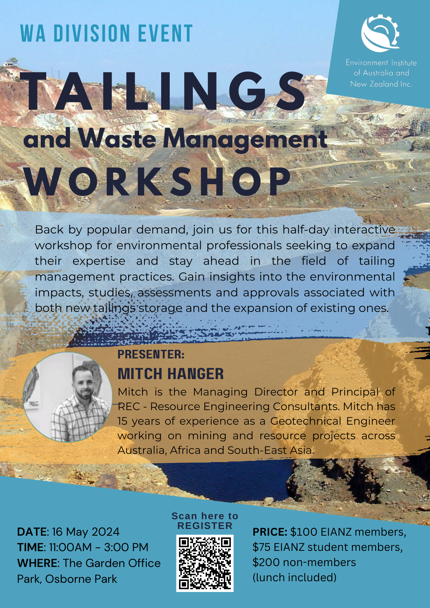 Back by popular demand, EIANZ’s WA Division is thrilled to announce another instalment of the Tailings and Waste Management Workshop.