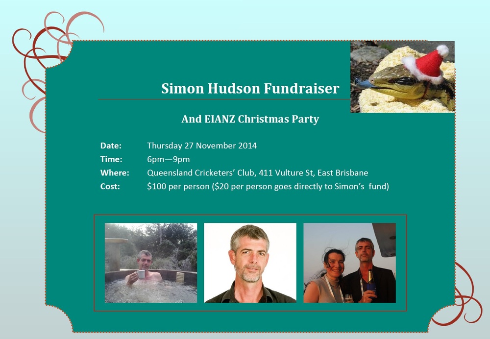 Christmas is a time for giving, a time for sharing and a time for reflection. This Christmas, please join the EIANZ – SEQ Division to raise funds to support a prominent member of our environmental family – Dr Simon Hudson. Simon has been diagnosed with advanced brain cancer and is currently undergoing extensive therapy to make life a little easier. Simon, and his wife Memento, invite you to join us on Thursday 27 November at the Queensland Cricketers’ Club, East Brisbane for a fundraising cocktail party.