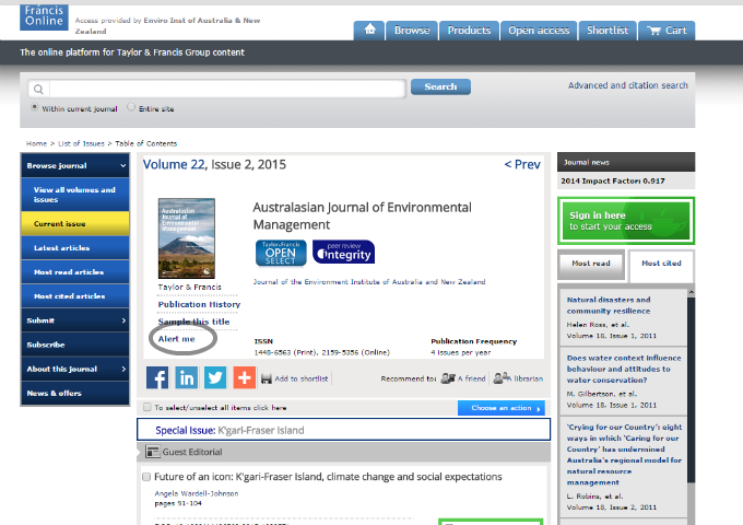 A subscription to the Australasian Journal of Environmental Management is included with all Full and Fellow memberships. Student and Associate members can elect to subscribe to the journal for a discounted fee upon application and/or renewal.