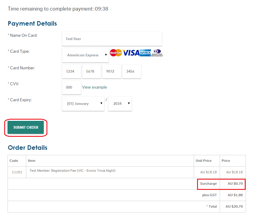If you elected to pay by credit card, fill out your card details. This example shows an American Express card, you can see a surcharge has been added. There is no surcharge for payments by Visa or Mastercard. When you have completed the details, click "Submit order".
