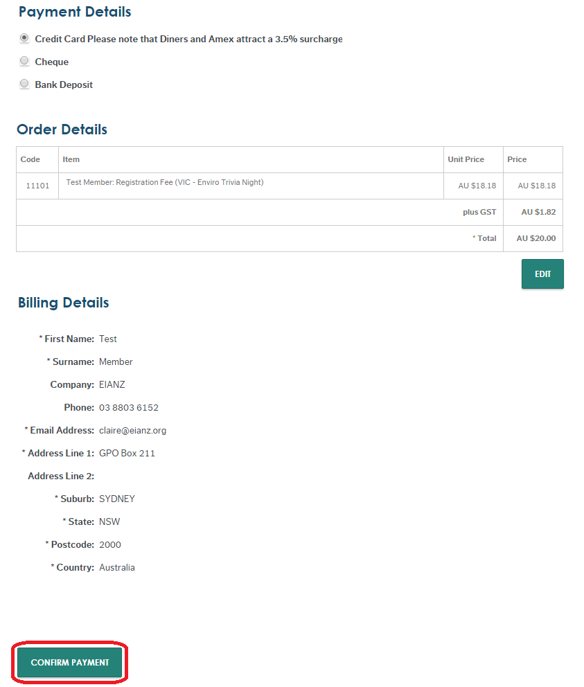 Select your payment method of either credit card or bank deposit (Please note: American Express incurs a 3.5% surcharge. Diners Club is no longer available. )