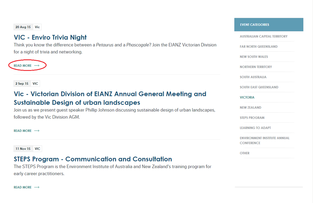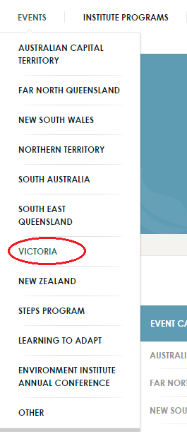 2. Move your mouse over “Events” in the main menu, then select the Division/Location of the event you wish to attend. Note that there are other events not kept under Division including the EIANZ Conference, Learning to Adapt and the Steps Program.